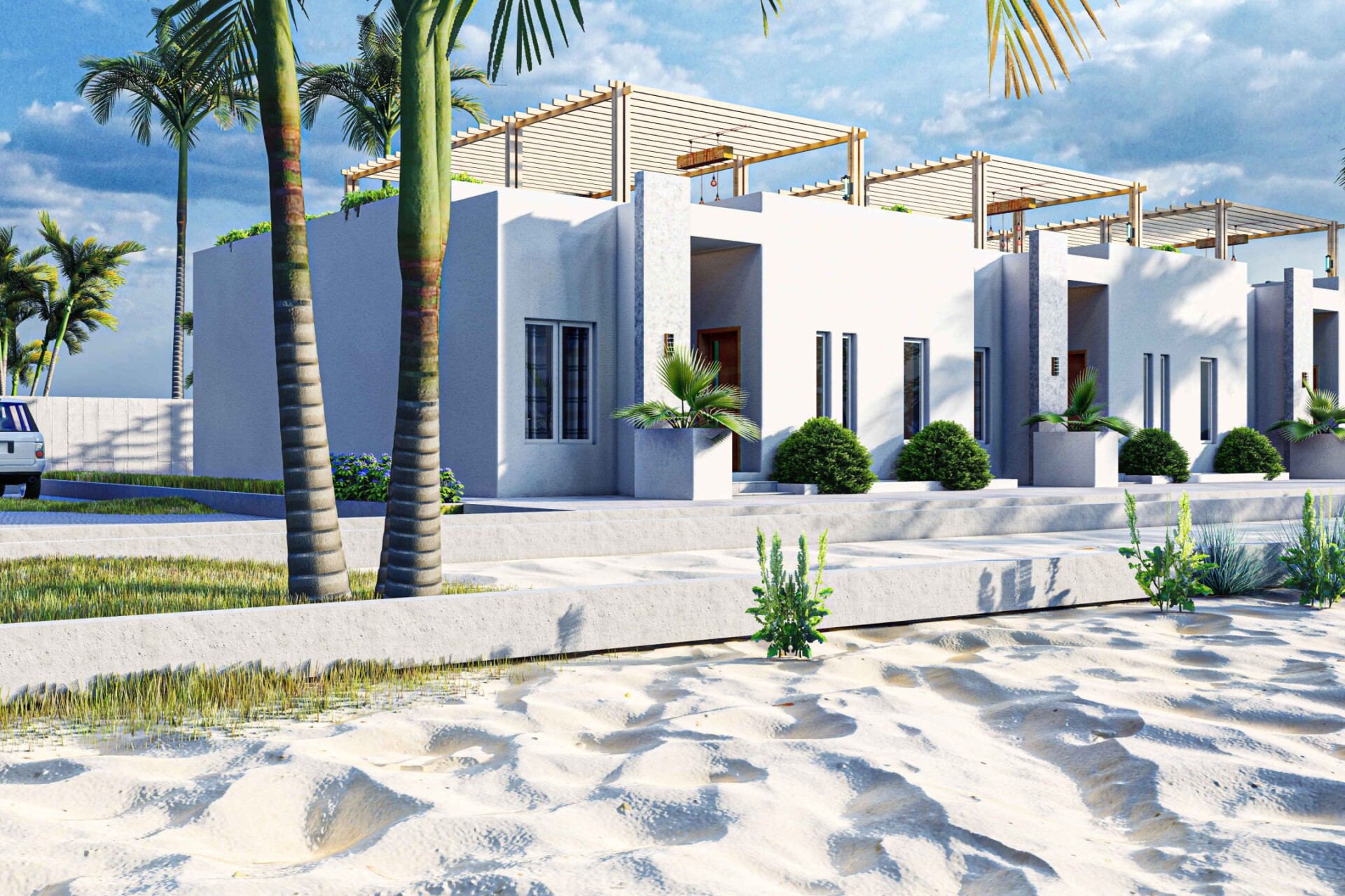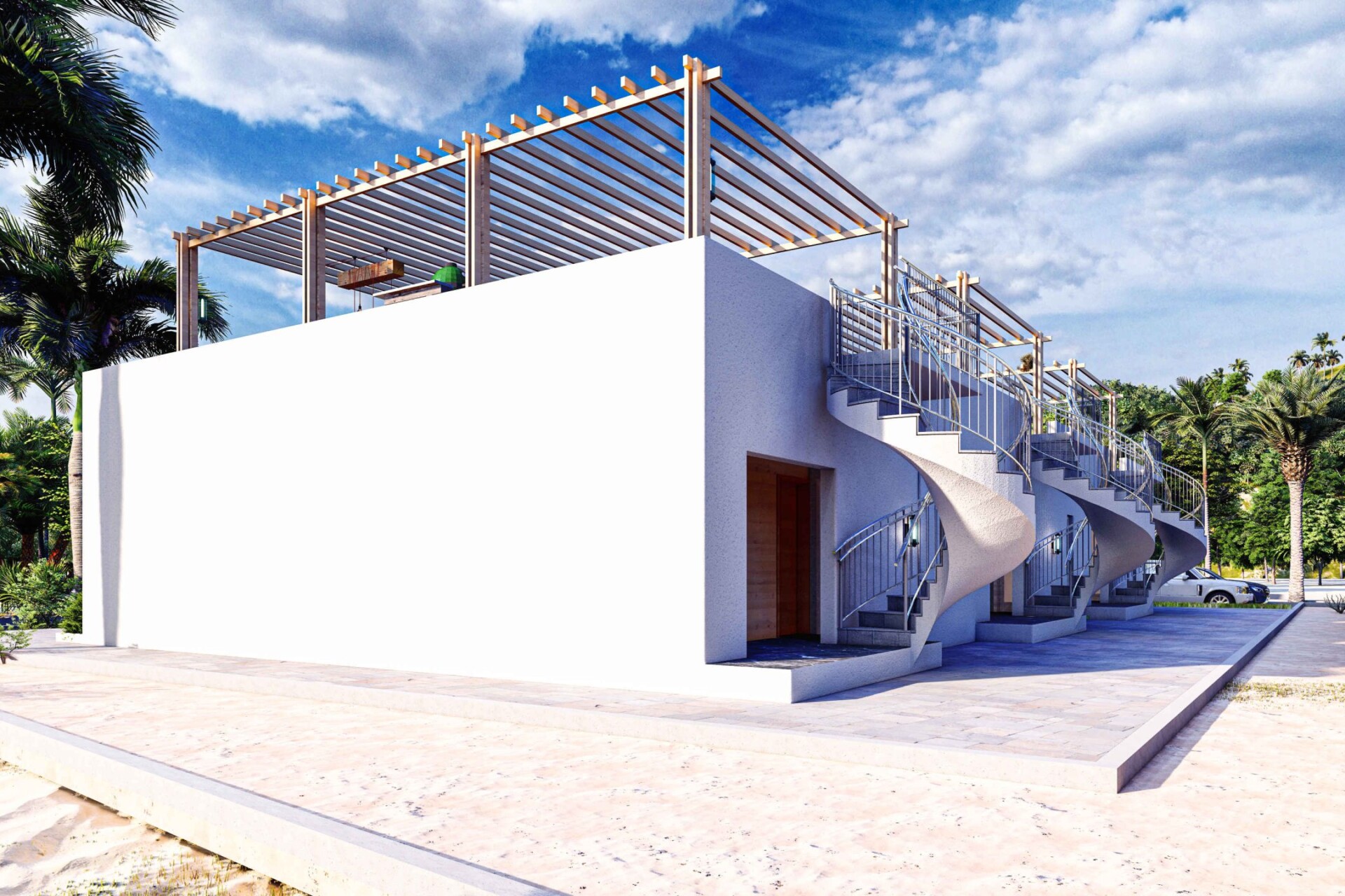 We were hired by a North American architectural company to create a triple-unit terrace design for a client in Turks and Caicos Island. The design needed to be suitable for the tropical climate and able to withstand hurricanes.