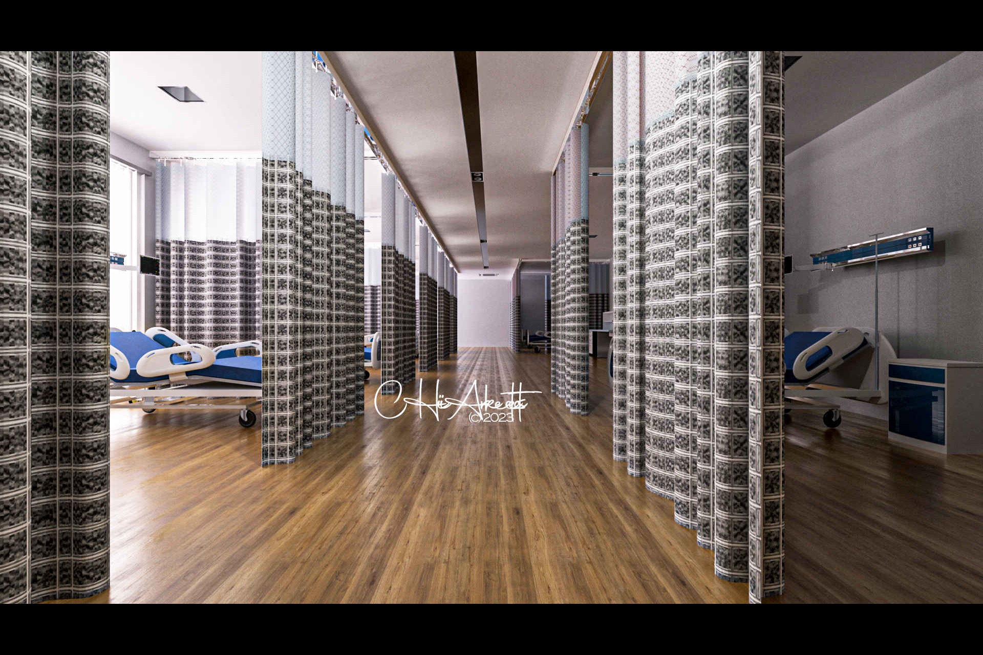 The proposed design is a comprehensive Infectious Disease Control Center, conceptualized as a mini campus composed of multiple facilities. It includes four major buildings spread across an expansive open field. The open spaces are intentionally designed to serve as temporary accommodation or emergency setups during outbreaks.